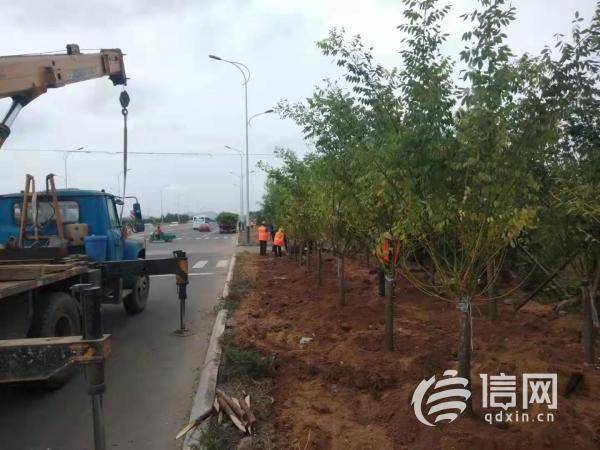 克日 ,在西海岸新区204国道城区以北段绿化工程现场 ,挖掘机挥舞长臂精准刨坑 ,大型吊车将苗木吊运至树坑内 ,工人们有的挥锹培土 ,有的牢靠苗木 ,施工现场一派忙碌情形。