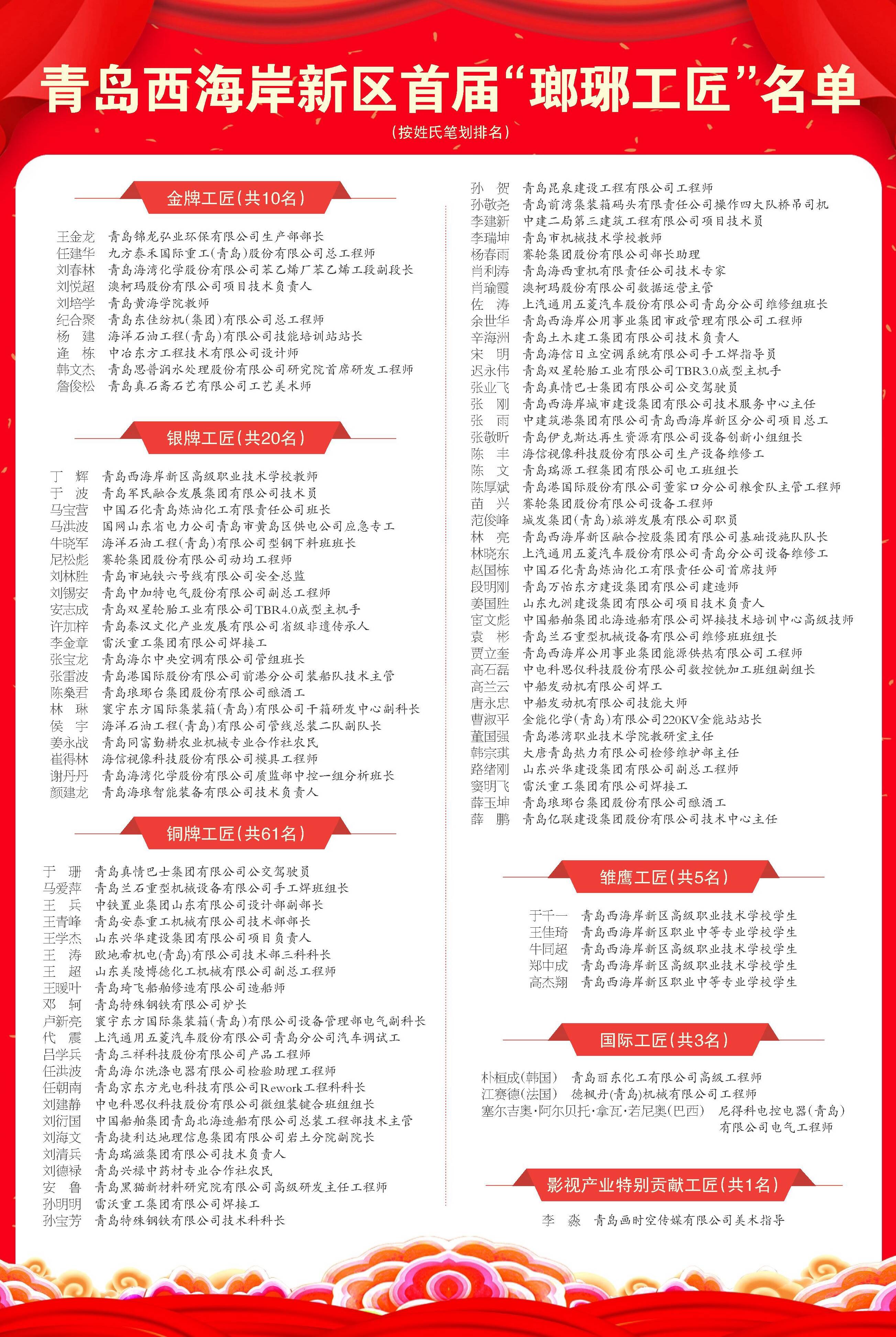 据先容,首届100名“瑯琊工匠”包括金牌工匠10名、银牌工匠20名、铜牌工匠61名、国际工匠3名、雏鹰工匠5名、影视工业特殊孝顺工匠1名,首次立异设置了国际工匠、雏鹰工匠种别。他们当中既有从国际、天下、省市手艺大赛中脱颖而出的优异选手,也有各行各业的手艺精英和致力于墟落振兴、身怀特技的“民间能手”,涵盖了船舶海工、高端装备、智能家电、芯屏、海洋生物医药等19个行业类型,实现新区“5+5+7”重点工业全笼罩,一线下层岗位职工占比达87%。